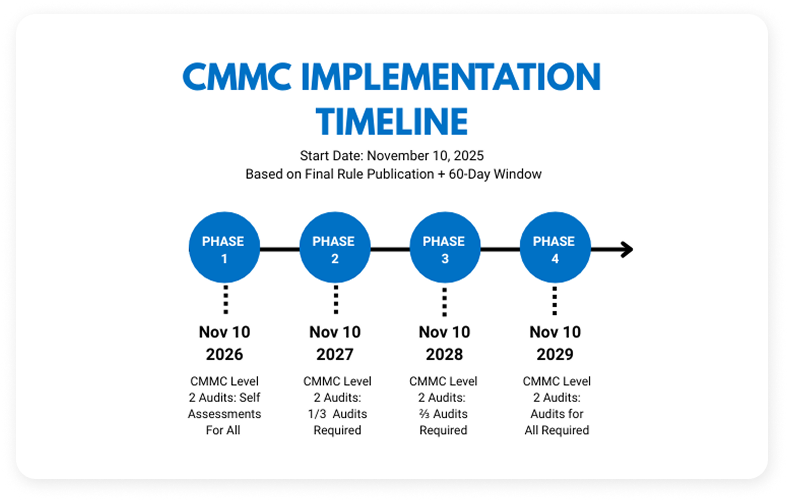 See the timeline below for the phased rollout of the CMMC final rule and key dates to keep in mind.
