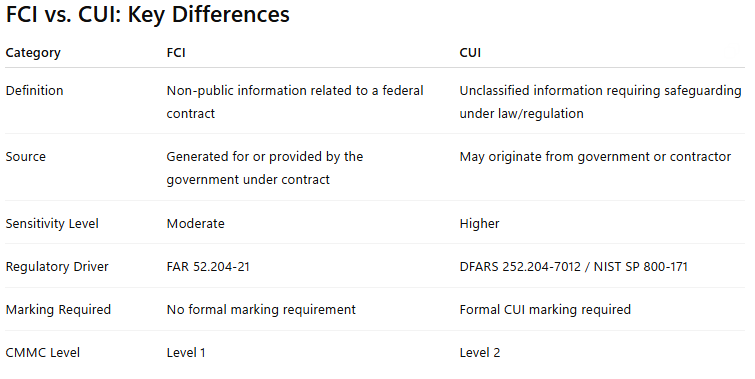 Understanding the distinction between CUI and FCI is essential for compliance, risk management, and successful participation in federal contracting.